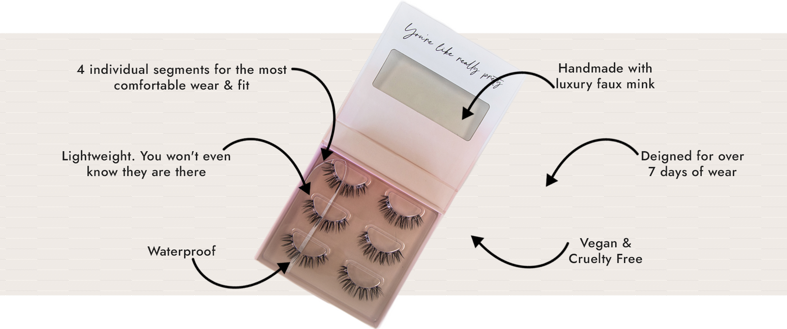 Wink kit lashes are carefully handmade with an almost invisible band making them practically weightless. They are pre- cut into segments for easy application.